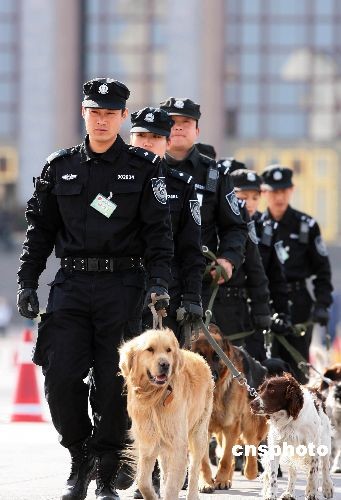 3月2日,全國(guó)政協(xié)第十一屆一次會(huì)議預(yù)備會(huì)議在北京人民大會(huì)堂舉行,安保人員攜警犬在天安門廣場(chǎng)巡邏,以確保會(huì)議順利進(jìn)行。中新社發(fā) 盛佳鵬 攝
