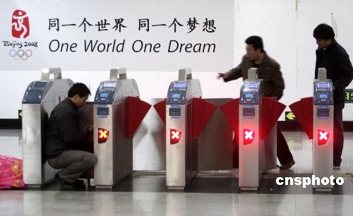 3月3日,工作人員在調試北京地鐵1號線天安門東站的自動檢售票系統(tǒng)。隨著奧運會臨近,北京地鐵1、2號線的新設備配套系統(tǒng)正在加緊調試,以便服務奧運會的正常使用。據工作人員介紹,地鐵車站安裝的新設備是自動檢售票系統(tǒng),出入口處的是閘機,其相應的配套設備還有自動售票和充值機。目前5號線已全線調試完畢,但還需時間對地鐵1、2、13號線進行調試,預計6月后,北京地鐵線路都要開通和使用自動檢售票系統(tǒng)。中新社發(fā) 吳芒子 攝