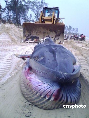 圖:重約二千斤的鯨魚在海南文昌擱淺死亡
