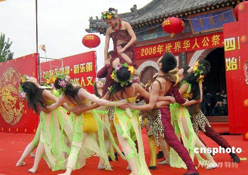 22日,第四屆伏羲文化旅游節(jié)在“羲皇圣里”河北省新樂市開幕。來自美國、加拿大、臺(tái)灣、香港等國家和地區(qū)的萬余名華人代表、學(xué)術(shù)社團(tuán)代表、伏羲文化專家、易學(xué)專家、各地客商及當(dāng)?shù)孛癖婟R聚“伏羲臺(tái)”,舉行2008年世界華人公祭人文始祖伏羲大典。新樂自古有“羲皇圣里”之稱,商周以來,這里就是世界華裔同胞尋根祭祖的圣地,每年陰歷三月十八的伏羲廟會(huì),香火鼎盛,連綿不絕,延續(xù)至今。圖為祭祀大典當(dāng)中的樂舞告祭。中新社發(fā) 牛琳 攝