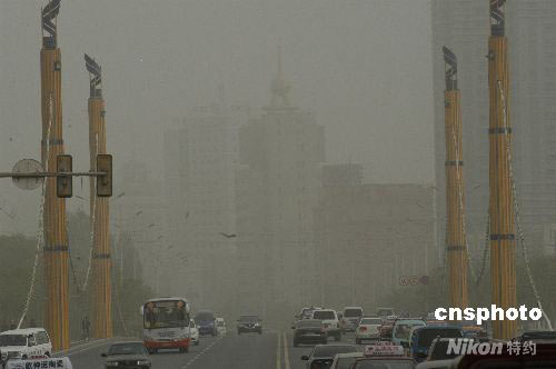 4月23日下午,在新疆庫爾勒市街頭,汽車在沙塵當中行駛。在4月18日--19日遭遇沙塵暴襲擊后,新疆庫爾勒于23日下午16時開始,再次遭遇沙塵襲擊。中新社發(fā) 確·胡熱 攝
