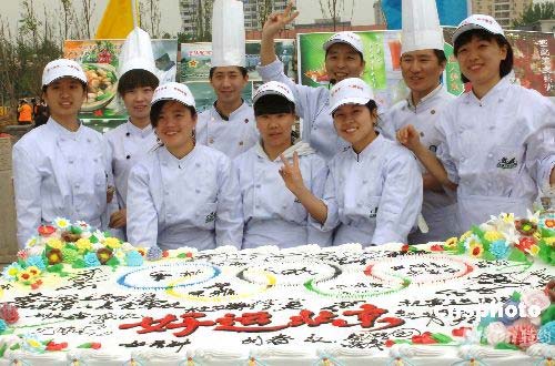 2000年4月24日,北京中央電視塔廣場(chǎng),第六屆中關(guān)村國(guó)際美食節(jié)開幕式在此隆重開幕。飲食企業(yè)和社團(tuán)分別在“綠色餐飲.奧運(yùn)美食”流行經(jīng)典菜式的展示活動(dòng)中展示自家拿手的菜肴。圖為北京唐人美食之夜技能培訓(xùn)學(xué)校學(xué)生們,展示自己做的“好運(yùn)北京”五環(huán)旗巨型蛋糕。當(dāng)日下午,這枚略小于乒乓球桌的蛋糕,將要被切開,學(xué)生將于與觀眾們共同分享。