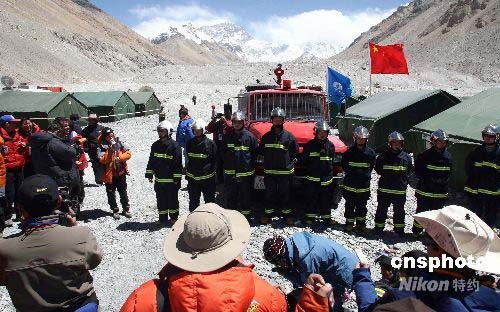 4月30日,受邀采訪(fǎng)2008北京奧運(yùn)會(huì)火炬接力珠峰展示活動(dòng)的中外媒體記者,集體探訪(fǎng)珠峰大本營(yíng),采訪(fǎng)駐扎在珠峰大本營(yíng)的消防官兵。中新社發(fā) 盛佳鵬 攝