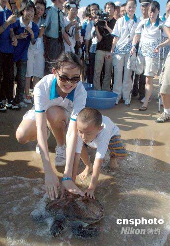 北京奧運會火炬接力海南省傳遞五月四日傳遞將在三亞首發(fā)。三日,聯想和"藍絲帶"在三亞組織保護海洋活動,倡導綠色奧運。圖為世界小姐張梓琳和孩童在三亞灣海邊放歸大海龜。中新社發(fā) 王辛莉 攝