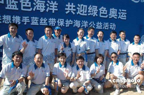 北京奧運會火炬接力海南省傳遞五月四日傳遞在三亞首發(fā)。三日聯(lián)想和"藍絲帶"在三亞組織保護海洋活動,倡導綠色奧運。圖為聯(lián)想奧運火炬手在三亞灣邊參與公益活動。中新社發(fā) 王辛莉 攝