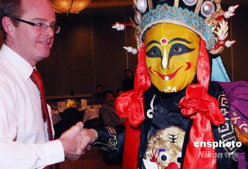 5月6日晚,在北京舉行的中外商貿(mào)合作項目洽談酒會上,來自四川的著名變臉藝人為嘉賓現(xiàn)場進行精彩的“變臉”,表演受到在座外國賓客的熱烈歡迎。中新社發(fā) 錢興強 攝