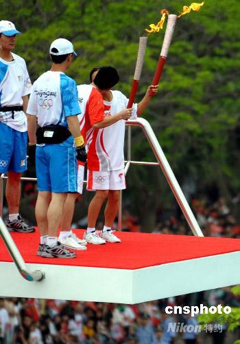 5月10日,六位跳水世界冠軍肖燕娟、林媛霞、李巧賢、池美蘭、蔡玉燕和孫淑偉作為火炬手集體登上中國跳水隊(duì)汕頭集訓(xùn)基地的十米跳臺(tái),傳遞奧運(yùn)圣火。最后,跳水界模范夫妻孫淑偉和蔡玉燕手持祥云火炬站在十米跳臺(tái)上激情擁吻在一起。 中新社發(fā) 廖攀 攝