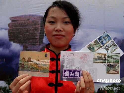 5月10日,印江郵政工作人員展示《頤和園》郵票。當(dāng)天,《頤和園》特種郵票一套6枚和1枚小型張?jiān)谫F州印江首發(fā), 印江土家族苗族自治縣舉辦了慶!额U和園》特種郵票發(fā)行活動(dòng)!额U和園》郵票內(nèi)容是十七孔橋、長(zhǎng)廊、石舫、諧趣園、玉帶橋、后湖,小型張是佛香閣。這套郵票是繼長(zhǎng)城、故宮、天壇后發(fā)行的又一套北京名勝題材郵票!额U和園》三個(gè)字,是清代書法家、貴州印江的嚴(yán)寅亮所書。中新社發(fā) 陳曉嵐 攝