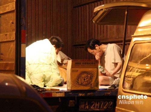 5月12日晚,成都的眾多市民均聚集在空曠地區(qū)或廣場過夜。據(jù)悉,截至13日零點,四川災(zāi)區(qū)死亡人數(shù)已達(dá)近萬人。圖為兩名當(dāng)?shù)厥忻裨谕T趶V場邊的貨車箱內(nèi)過夜。中新社發(fā) 郭晉嘉 攝