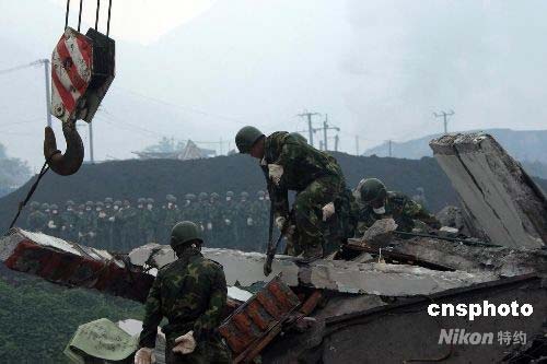 5月14日,中國(guó)空降兵某部已出動(dòng)6500人在四川什邡縣境內(nèi)災(zāi)情最嚴(yán)重的洛水、紅白等地緊急搶救被困群眾。圖為空降兵戰(zhàn)士用鐵鉗剪斷鋼筋清混凝土救人。中新社發(fā) 譚超 攝