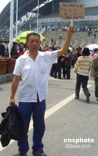 5月15日上午,來自受地震災(zāi)害較為嚴(yán)重的四川綿陽(yáng)安縣沸水鎮(zhèn)的一名男子來到綿陽(yáng)市抗震救災(zāi)最大的救助點(diǎn)——九州體育館外舉牌尋找親人。中新社發(fā) 霍潺 攝