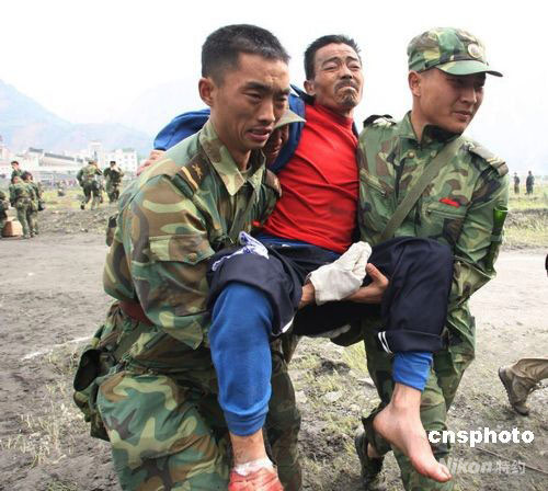 5月15日,武警官兵把剛剛搶救出的的汶川縣重傷災民送上直升機,運到成都救治。中新社發(fā) 張雷 攝