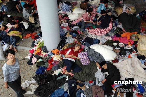 五月十五日,從四川綿陽北川羌族自治縣等災(zāi)區(qū)救出的地震災(zāi)民被安置在成都九洲體育館救助站接受救助,高峰期該救助站曾有三萬余名災(zāi)民聚集。中新社發(fā) 陳文 攝