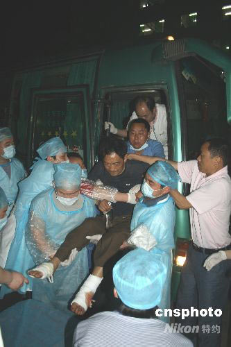 5月15日23時,又一批90名從地震重災區(qū)四川綿竹市的傷員,被連夜運到眉山市第二人民醫(yī)院,當?shù)蒯t(yī)務人員、青年志愿者和剛剛趕到這里增援的吉林省醫(yī)療隊等數(shù)百人齊心協(xié)力,經過1個小時的奮斗后把這批傷員安置到病房,并立即展開救治。中新社發(fā) 堯遙 攝