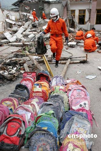 5月15日,在四川省什邡市紅白鎮(zhèn)中心小學(xué)廢墟旁,河南省消防總隊(duì)抗震救災(zāi)突擊隊(duì)的搜救人員將找到的孩子們的書包整齊排放,等待家長(zhǎng)認(rèn)領(lǐng),以告慰生者。五顏六色的小書包仿佛一個(gè)個(gè)鮮活的幼小生命立于記者的眼前。 中新社發(fā) 張曉理 攝