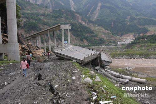 四川大地震,都江堰到汶川縣映秀鎮(zhèn)沿線民房和交通受損嚴(yán)重,許多受困的居民紛紛離家趕往安全地點,也有許多居民想回家看望地震區(qū)的親人。圖為都汶高速的百花大橋20米左右被地震震垮,多處橋墩受損壞。中新社發(fā) 黃榮 攝