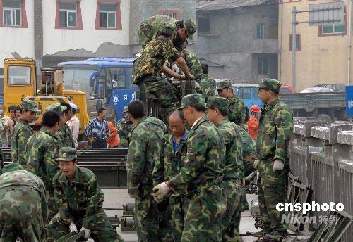 5月16日,由都江堰都往汶川的壽江公路大橋因地震山體移位造成橋面傾斜,車輛和機械無法通行。四川雅安民兵專業(yè)應(yīng)急分隊奉命迅速趕赴事發(fā)地點,利用制式公路鋼橋?qū)κ軗p橋梁進行加固。中新社發(fā) 吳蘇琳 攝