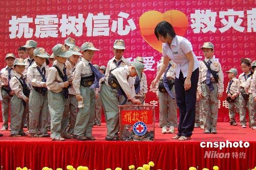5月17日,廣西南寧一些兒童通過義賣自己的心愛之物、上臺表演等形式,為四川地震災區(qū)募捐,號召更多的愛心人士為災區(qū)獻愛心。中新社發(fā) 劉萬強 攝