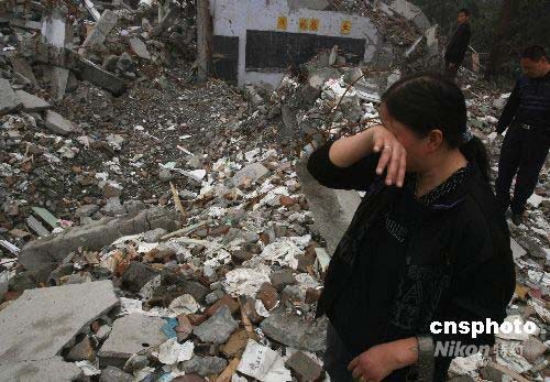 五月十七日,一位哭腫雙眼的母親徘徊在汶川大地震中垮塌的灌縣聚源中學(xué)廢墟上,在她失蹤的十四歲兒子上課位置尋找課本書包沒有結(jié)果,淚流不停。中新社發(fā) 賈國榮 攝
