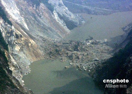 四川省汶川大地震災區(qū)五月十七日頻繁發(fā)生余震,岷江兩岸多處被塌方形成危險的堰塞湖。中新社發(fā) 賈國榮 攝