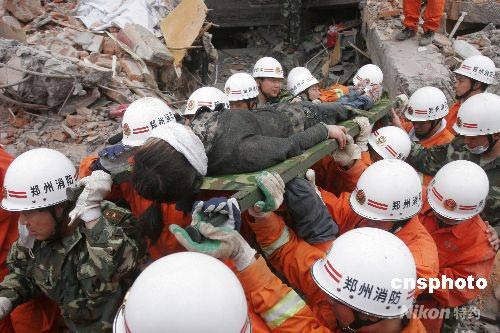 5月17日18時18分,四川省什邡市鎣華鎮(zhèn)鎣華實業(yè)有限公司31歲女工卞剛芬在震后本廠綜合大樓廢墟下被埋124小時后,經(jīng)河南消防搶險救援突擊隊連續(xù)31小時的艱苦營救后奇跡生還,她意識清醒,對周圍的人們說著“感謝”。中新社發(fā) 張曉理 攝