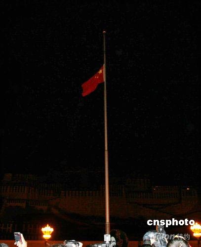 五月十九日凌晨零點(diǎn)時(shí)分,西藏自治區(qū)在布達(dá)拉宮廣場(chǎng)舉行降半旗儀式,向“五·一二”四川大地震死難同胞致哀,此舉為新中國(guó)成立以來(lái),布達(dá)拉宮廣場(chǎng)首次為死難普通民眾降半旗。中新社發(fā) 柳俊武 攝