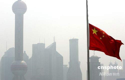 5月19日全國哀悼日,上海下半旗沉痛哀悼四川地震遇難同胞。為表達(dá)全國各族人民對四川汶川大地震遇難同胞的深切哀悼,國務(wù)院決定,2008年5月19日至21日為全國哀悼日。在此期間,全國和各駐外機(jī)構(gòu)下半旗志哀,停止公共娛樂活動(dòng),外交部和中國駐外使領(lǐng)館設(shè)立吊唁簿。5月19日14時(shí)28分起,全國人民默哀3分鐘,屆時(shí)汽車、火車、艦船鳴笛,防空警報(bào)鳴響。中新社發(fā) 湯彥俊 攝