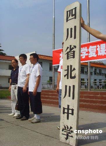圖:地震重災(zāi)區(qū)北川中學(xué)校牌重新屹立(2)