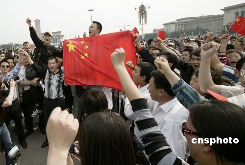 2008年5月19日14時(shí)31分,默哀結(jié)束后,在北京天安門廣場的近萬名民眾仍然聚集在一起,手持國旗和菊花,高喊:“加油四川!加油中國!”中新社發(fā) 李剛 攝
