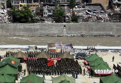 圖:在地震核心重災區(qū)映秀鎮(zhèn)的救險官兵默哀