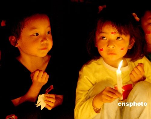 5月20日,安徽省淮北市網(wǎng)友的孩子在用燭光哀悼汶川大地震遇難者。當(dāng)晚8時(shí)許,安徽省淮北市許多論壇網(wǎng)友自發(fā)帶著孩子聚集在淮北兩宮廣場,手持點(diǎn)燃的蠟燭,沉痛哀悼在地震中遇難的同胞,“加油中國、加油四川”的呼聲響徹現(xiàn)場。中新社發(fā) 王璋聞 攝