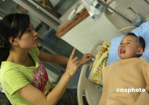 5月21日,在四川汶川5·12大地震中被救出后向解放軍“行隊(duì)禮”的北川3歲男孩郎錚在綿陽(yáng)市解放軍某醫(yī)院成功完成斷臂續(xù)接手術(shù),精神面貌很好。圖為郎錚與媽媽吳曉紅進(jìn)行語(yǔ)言交流。中新社發(fā) 趙振清 攝