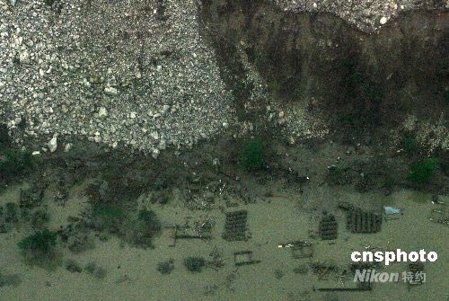 五月二十二日,汶川大地震第十一天,空中可見大山崩塌泥石堵塞河道淹沒一座村莊。中新社發(fā) 賈國榮 攝