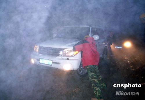從5月21日晚至22日凌晨,中新社記者通過四川省雅安市的S210省際公路前往臥龍,海拔4000多米的夾金山頂峰被進出汶川地震重災(zāi)區(qū)的大型貨車、救護車、轉(zhuǎn)移災(zāi)民車等運輸車輛堵塞,采訪車多次深陷泥濘之中。由于目前通往汶川地震災(zāi)區(qū)的被毀公路在修復(fù)后極為脆弱,因此這條過去不起眼的公路成為連結(jié)成都與汶川的生命線。中新社發(fā) 任晨鳴 攝