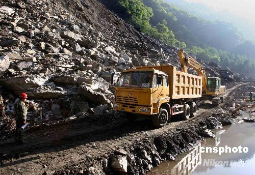 5月24日,從重慶趕來的武警交通直屬工程部的部隊在燒湯河畔搶修從四川省小金縣至汶川縣映秀鎮(zhèn)的303省際公路。5·12大地震造成比鄰震中映秀鎮(zhèn)的臥龍與世隔絕,嚴重的塌方積石形成多個堰塞湖威脅這里的民眾與中國大熊貓科研中心的安危。中新社發(fā) 任晨鳴 攝