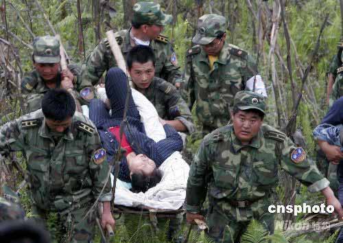 5月24日,駐豫某紅軍師、號稱“鐵軍”的葉挺獨立團22名官兵渡岷江、翻大山,將大山深處的四川省汶川縣旋口鎮(zhèn)黃家村3名在地震中受傷骨折的村民或用簡易擔架,或輪流背負,歷經(jīng)9小時轉(zhuǎn)移到安全地區(qū),并及時送往都江堰醫(yī)治。中新社發(fā) 張曉理 攝