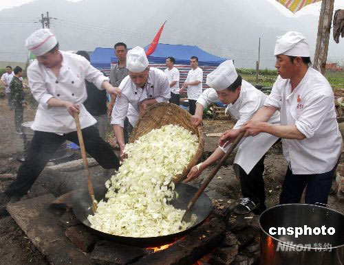 2008年5月25日下午6時(shí),四川彭州市小魚洞鎮(zhèn)大南村田地上,來自北京的大廚們在為當(dāng)?shù)卮迕褡觥百c災(zāi)飯”。24日開始,北京美食聯(lián)盟組織北京全聚德、大鴨梨、便宜坊等大飯店的105名廚師,籌集200萬元資金在災(zāi)區(qū)分設(shè)3個(gè)賑災(zāi)點(diǎn),免費(fèi)為災(zāi)區(qū)群眾供應(yīng)飯菜。中新社發(fā) 張曉理 攝