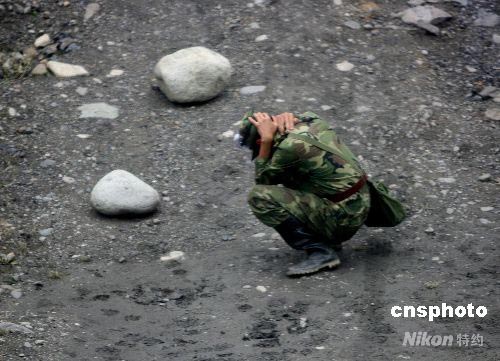 汶川大地震發(fā)生十五天以來(lái)余震不斷,一位搶險(xiǎn)的士兵突遇滑坡,果斷蹲地減少人體面積,同時(shí)用雙手牢牢保護(hù)頭部,終于化險(xiǎn)為夷。中新社發(fā) 賈國(guó)榮 攝