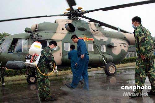圖:震區(qū)中國空軍為飛行員和飛機消毒