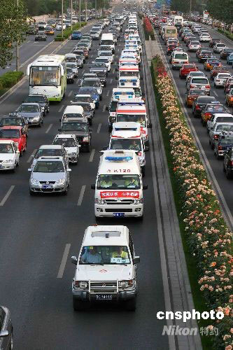 圖:北京91輛救護車連成傷員生命線