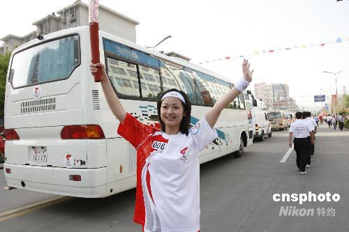 5月29日,奧運圣火在“能源之都”淮南傳遞。圖為與白血病魔頑強斗爭的女大學(xué)生,奧運火炬手孫潔,她高舉火炬并為四川加油。她說她的生命奇跡不僅來自她的堅強毅力,更是來自社會的愛。她告訴四川人民,我們一起加油。 中新社發(fā) 張婭子 攝