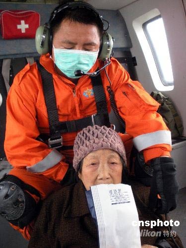 5月31日,90歲老奶奶被民航直升機(jī)南航珠海S76型7307號(hào)飛機(jī)成功救出。家住綿竹市清平天池南木溝的老人,地震前獨(dú)居深山。5.12汶川地震發(fā)生時(shí),老人在室外乘涼,腰部被山石擊傷。因出山和進(jìn)山路中斷與外界隔絕聯(lián)系,一直被困深山中。19天來靠吃野菜維持生命。民航直升機(jī)抗震救災(zāi)基地接到綿竹搜救部隊(duì)的消息后,當(dāng)即派出兩個(gè)機(jī)長劉洋、段俊德執(zhí)行飛行任務(wù),交通部南海第一飛行隊(duì)救生員李春林、絞車手宋樂平一同前往。由于地形復(fù)雜,山式狹隘,峽谷電線縱橫交錯(cuò),沒有可著地條件,搜救人員只好實(shí)施空中救援。上午10時(shí)40分成功將老人救出。中新社發(fā) 張鈺昱 攝
