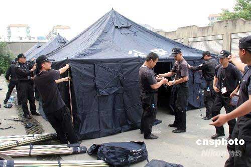 6月1日,經(jīng)過(guò)53小時(shí)日夜兼程到達(dá)四川綿陽(yáng)集結(jié)地的福州市公安局特警支隊(duì)民警們迅速搭建宿營(yíng)地,為開(kāi)使執(zhí)勤做好準(zhǔn)備。中新社發(fā) 常剛 攝