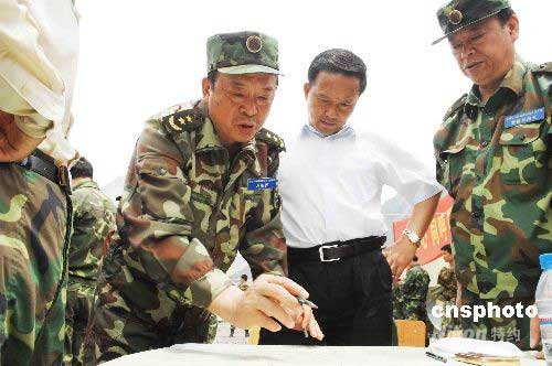 成都軍區(qū)司令員李世明中將6月2日在災區(qū)映秀組織指揮軍地人員搜尋失事直升機。中新社發(fā) 陳文 攝