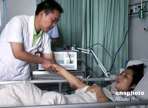 6月2日,廣西醫(yī)科大學(xué)第一附屬醫(yī)院康復(fù)技師龍耀斌在給傷員郭昌碧做術(shù)后康復(fù)訓(xùn)練。據(jù)了解,該醫(yī)院對第一期55例四川地震傷員實施手術(shù)已全部完成,目前治療的重點開始向康復(fù)轉(zhuǎn)移,主要包括心理康復(fù)和肌體功能的康復(fù),已有心理醫(yī)生和理療師開始介入到康復(fù)治療當(dāng)中。中新社發(fā) 林艷華 攝