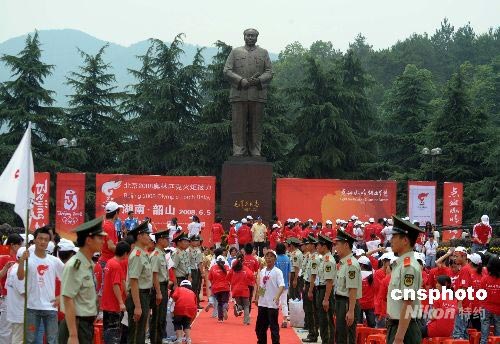 6月5日,奧運(yùn)圣火湖南湘潭、韶山站傳遞結(jié)束慶典,在韶山的毛澤東銅像廣場(chǎng)舉行。儀式結(jié)束后,民眾仍久久不愿離去。中新社發(fā) 廖攀 攝