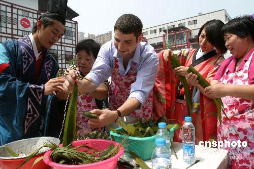 六月六日,上海黃浦區(qū)著名旅游景點(diǎn)豫園內(nèi),一名外籍人士和上海市民一起參加包粽子比賽。在比賽結(jié)束后,一批新鮮出爐的粽子即被送往社區(qū)內(nèi)參加抗震救災(zāi)的志愿者及川籍居民代表手中。中新社發(fā) 夏愛(ài)民 攝