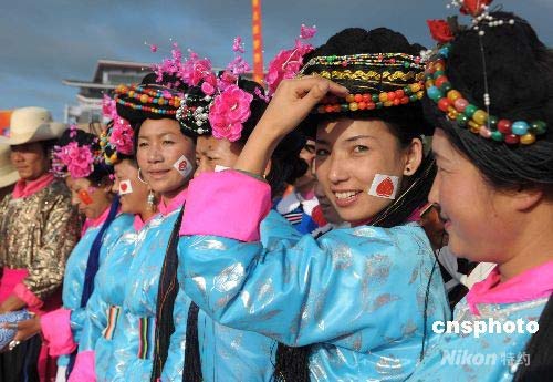 圖:"女兒國"的摩梭女歡慶奧運(yùn)圣火到來