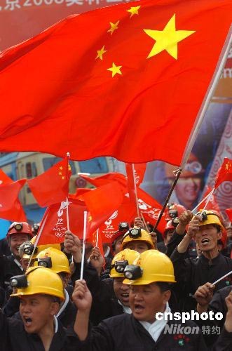 6月27日,奧運(yùn)圣火在山西大同市傳遞,大同煤礦工人喜迎火炬。中新社發(fā) 華山大 攝