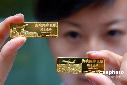 7月1日,由中國國家博物館藝術(shù)品開發(fā)中心權(quán)威監(jiān)制國道黃金發(fā)行的“海峽兩岸直航紀(jì)念金條”在北京亮相。2008年6月13日上午,海峽兩岸關(guān)系協(xié)會會長陳云林與海峽交流基金會董事長江丙坤在釣魚臺國賓館簽署《海峽兩岸包機會談紀(jì)要》,兩岸周末包機將于7月4日起正式啟航。黃金全國僅限量2008套,全套包括2根25克AU9999金條。第一根金條的主畫面是空中客機、中國大熊貓及“團(tuán)團(tuán)圓圓”字樣;第二根金條主畫面是空中客機和臺灣阿里山風(fēng)景。金條背面是關(guān)于《海峽兩岸包機會談紀(jì)要》的簽署情況概述。中新社發(fā) 鄒憲 攝